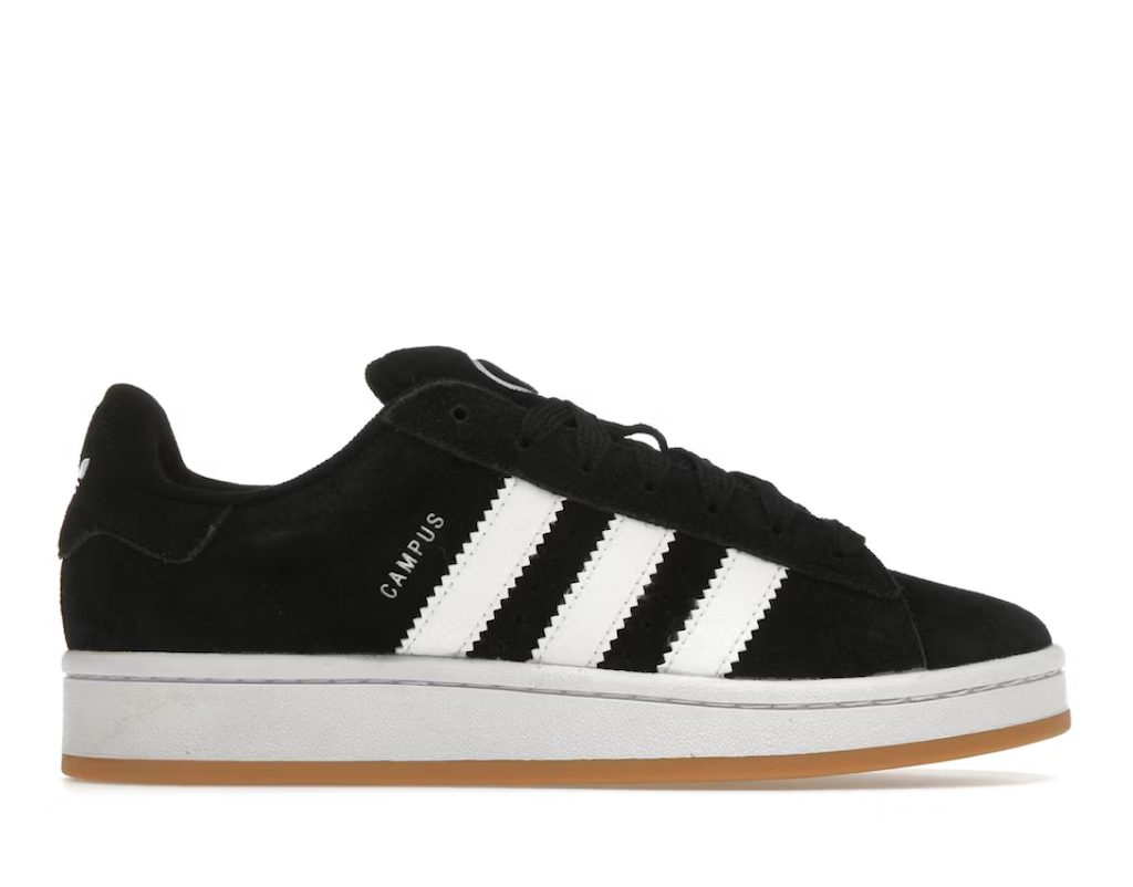 adidas Campus 00s Black White Gum (GS) charakteryzują się minimalistyczną estetyką, zamszową cholewką ozdobioną kultowymi trzema paskami i logo Trefoil.