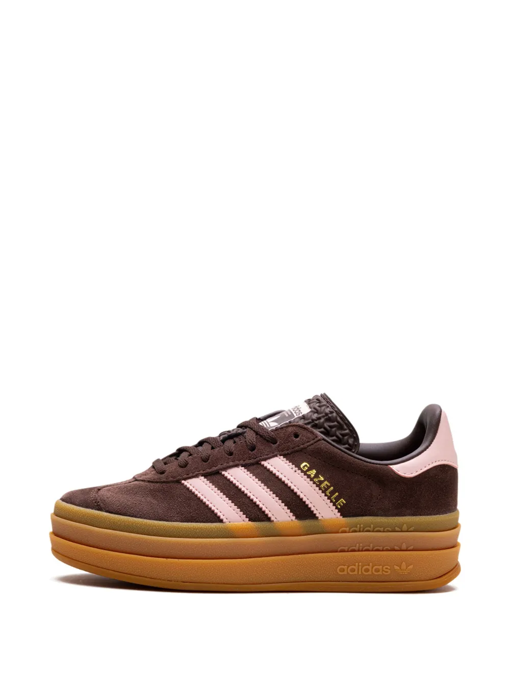 Cholewka wykonana jest z wysokiej jakości zamszu w odcieniu Auburn, a tonalne nakładki na przedniej części buta i panelach sznurowania nadają całości spójnego wyglądu. Charakterystyczne trzy paski adidas i pięta w kolorze Icey Pink dodają subtelnego kontrastu, podkreślając unikalny design. Na bocznym panelu widnieje klasyczne złote logo Gazelle, a na języku umieszczono emblemat adidas.