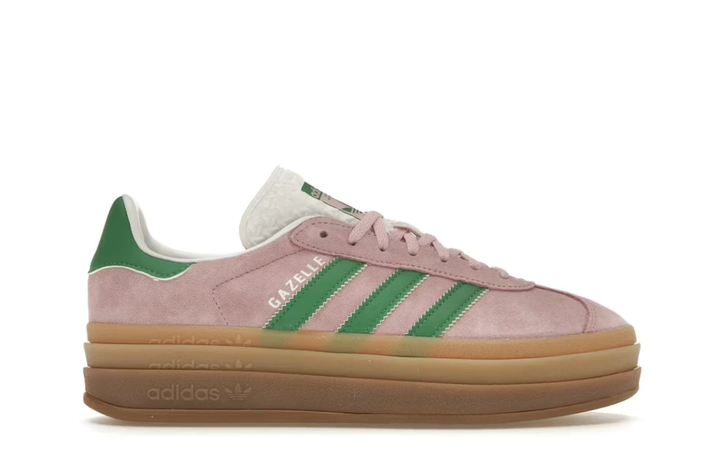 Jednak najbardziej przyciągającą wzrok cechą jest gumowa platforma pod stopami. Ma ona trzy warstwy podeszwy zewnętrznej adidas, które tworzą gradient koloru gumy. Każda podeszwa zewnętrzna ma wytłoczony napis „adidas” i małą koniczynkę. Cholewka wykonana jest z zamszu True Pink z tonalnym toeboxem w kształcie litery T w tym samym kolorze. Zarówno ząbkowane logo z 3 paskami, jak i zapiętek są w kolorze zielonym i są obrysowane kolorem Cloud White. Napis „GAZELLE” w kolorze metalicznego złota przypomina o dziedzictwie buta z lat 70. i jego pochodzeniu z kortów halowych.