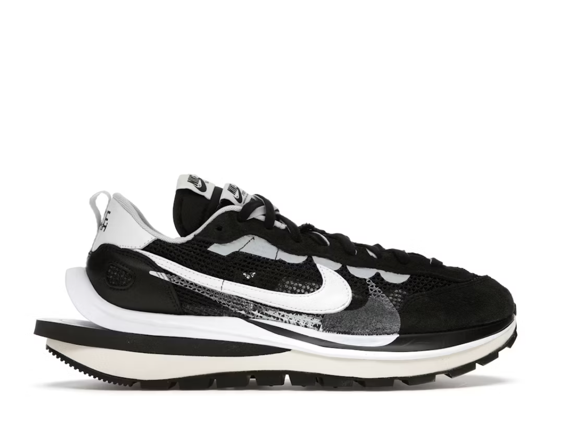 Nike Sacai Vaporwaffle Black / White czerpie wskazówki z oryginalnej podeszwy Swoosh Waffle i odwraca ją na głowie, dodając grubszą, ułożoną podeszwę środkową, która wystaje z pięty. Następnie cholewka ma podobieństwa do Nike Cortez, ale zamienia tradycyjną skórę na czarny zamsz i siateczkę w całości, aby zapewnić przewiewność. Podobnie jak w poprzednich projektach z Nike, Sacai dodaje zarówno drugi Swoosh w kolorze białym, jak i język, kontynuując swój warstwowy motyw.
